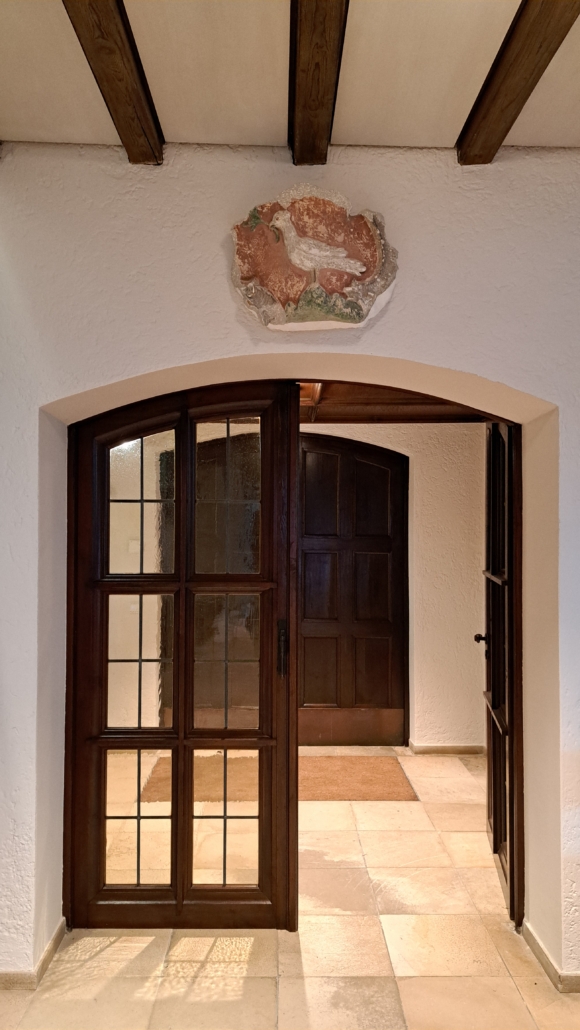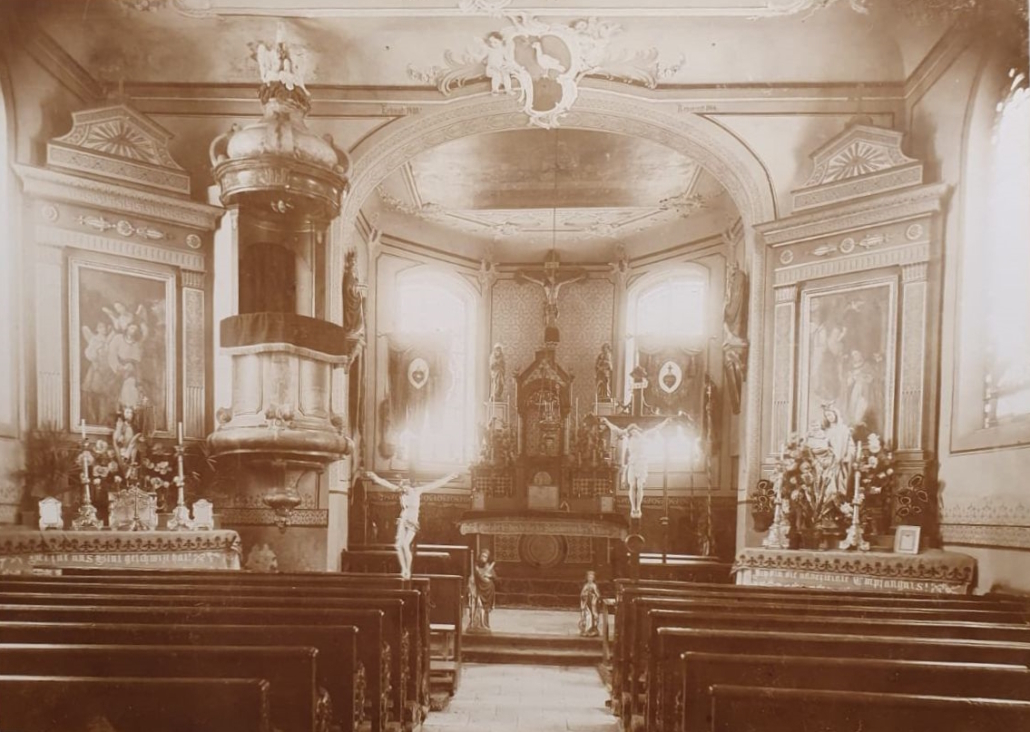 Als bald darauf, anno 1772, die Kirchendecke neu gemacht und schön mit Stuck verziert wurde, da ließ der Pfarrer durch den Stuckateur über dem Chorbogen eine Kartusche anbringen und darin auf rotem Grund eine weiße Friedenstaube auf grünem Dreiberg stehen setzen.